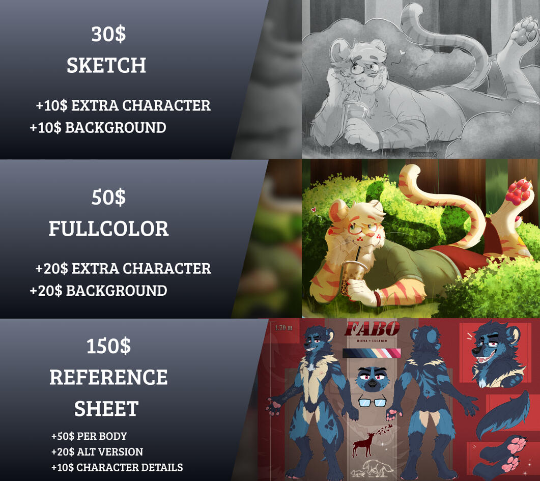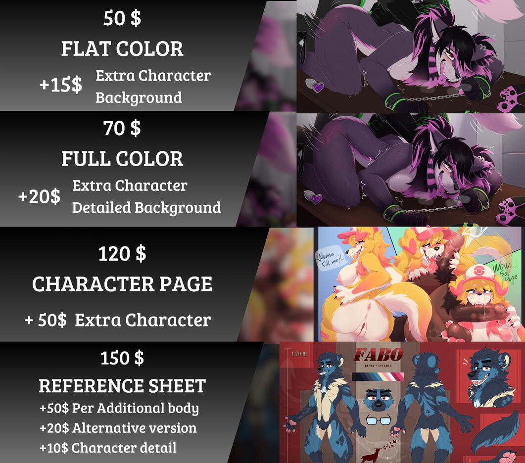 Regarding the things that can be drawn, both SFW and NSfW are varied. I can do any type of situation or fetish (with exceptions), but in the case of more sensitive things, they would fall into the category of private or anonymous commissions, which would be strictly between client and Artist (in case you want to publish them on social networks, a version without signature or commission watermark).Payments only by Paypal invoice (Give your paypal email to the artist).The client has the right to make 5 changes during the Sketch phase. And another 2 when the drawing is in the base coloring phase (color changes only).